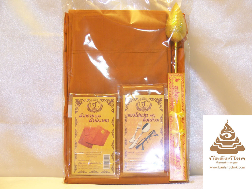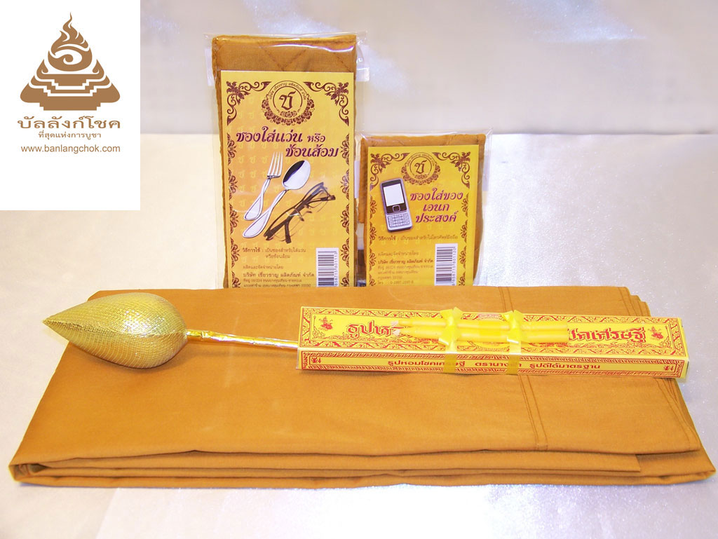 ชุดสบง ประกอบด้วย • สบง • ซองใส่ช้อนส้อม/แว่นตา • ซองใส่โทรศัพท์มือถือ • ธูป เทียน ดอกบัวทอง