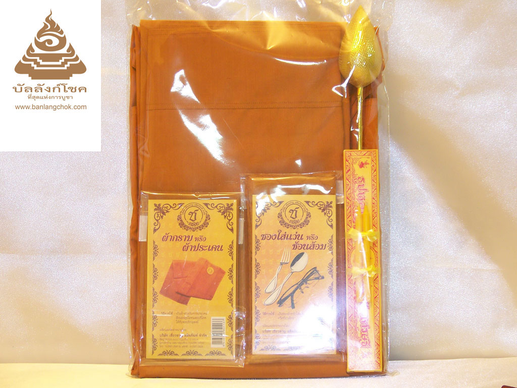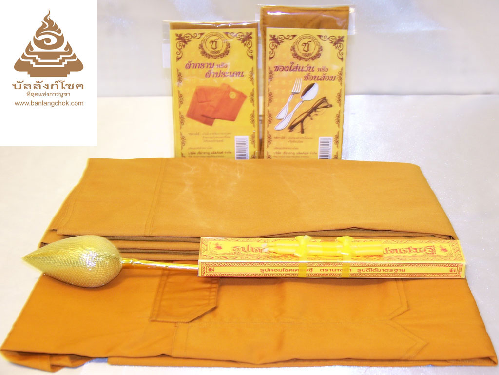 ชุดอังสะ สบง ประกอบด้วย • อังสะ • สบง • ผ้ารับประเคน • ซองใส่ช้อนส้อม/แว่นตา • ธูป เทียน ดอกบัวทอง